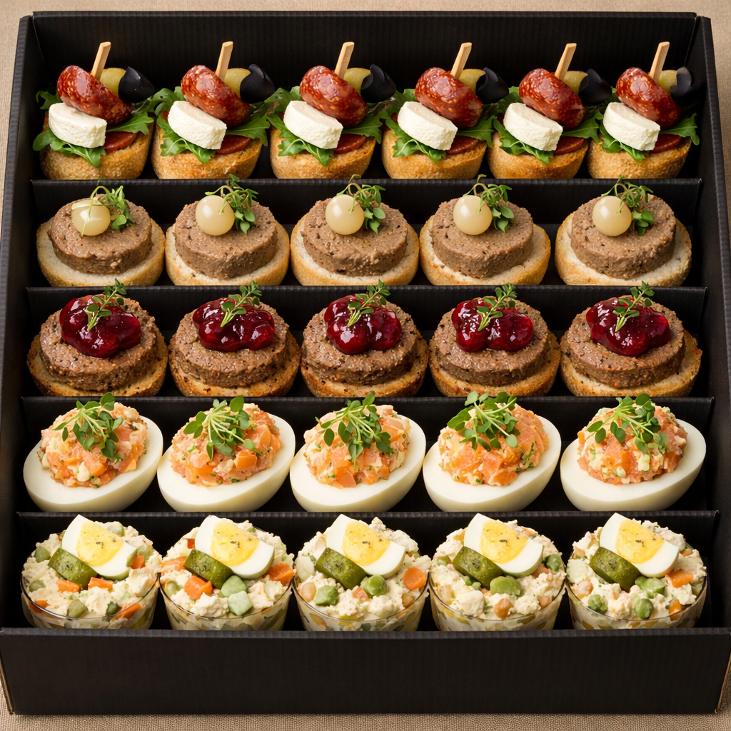25 szt. mini kanapeczek na slice’ach bagietki białej i wieloziarnistej.